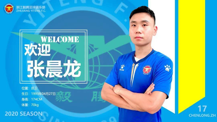 浙江毅腾足球俱乐部近日与张晨龙签订工作合同,张晨龙正式加盟浙江毅腾轻纺城队,将代表球队征战新赛季中乙联赛。