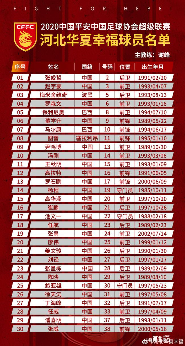 在2020赛季的河北华夏幸福大名单中,不仅有张呈栋、任航、董学升、尹鸿博、池文一等1988/89年龄段球员,同时还有赵宇豪、罗森文、冯刚、王秋明等90后球员,而且在这份大名单中,还有多达近10名U23球员,不仅年龄结构合理,还完全可以实现传帮带、老带新的目的。即便是几名外援,高拉特(1991)、梅米舍维奇(1993)、保利尼奥(1994)、马尔康(1994)、图雷(1995)等也都正值当打之年。
