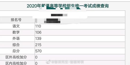 没有特长加分,仅凭普通高考,山东鲁能泰山足球学校2001年龄段球员吴梓岳在网上晒出的高考成绩让很多人直呼“不可思议”。