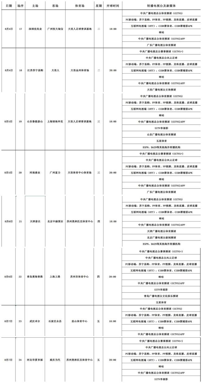 8月3日,中超第3轮转播计划公布。央视全场直播8场比赛、ESPN等海外机构转播鲁能VS申花、泰达VS国安这两场。