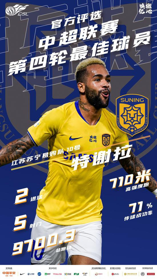 中超联赛APP讯 8月12日晚,2020中国平安中超联赛第四轮战罢,江苏苏宁易购外援特谢拉获得本轮最佳球员殊荣。