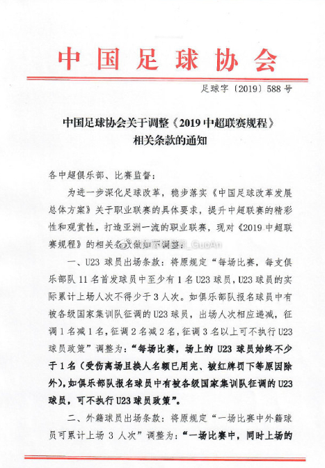 郭全博作为U23被红牌罚下,按照今年的规则:“每场比赛中,每队至少保持1名U23球员(1997年1月1日及以后出生的非港澳台的国内球员)在场上,受伤离场且换人名额已用完、被红牌罚下等原因除外”。也就是说,国安没必要再上一名U23来完成U23的任务,但是热内西奥却选择让U23球员侯永永上场,替换下了进球功臣阿兰。不知这次换人是热内西奥没读懂规则还是战术需求。
