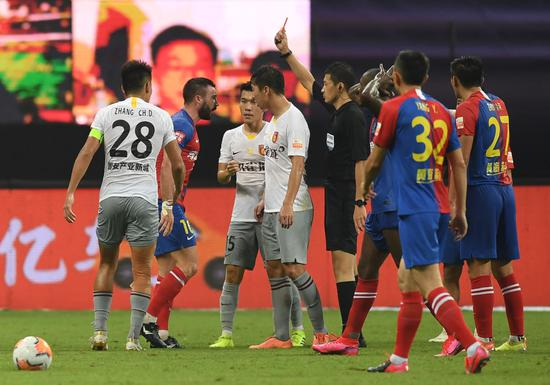 8月27日,主裁判张雷(右四)向青岛黄海青港队球员亚历山德里尼(左二)出示红牌。当日,在2020赛季中国足球协会超级联赛第一阶段(苏州赛区)第七轮比赛中,青岛黄海青港队以1比2不敌河北华夏幸福队。新华社记者季春鹏摄