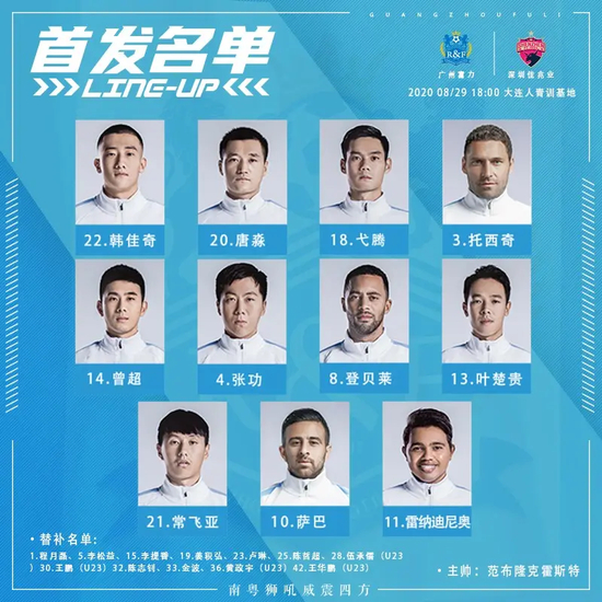本场比赛,广州富力首发阵容有所调整。门将依然是韩佳奇,弋腾与托西奇依然继续搭档中后卫,边后卫还是唐淼和曾超。中场则有登贝莱、张功和叶楚贵。锋线则是萨巴、雷纳迪尼奥和常飞亚。