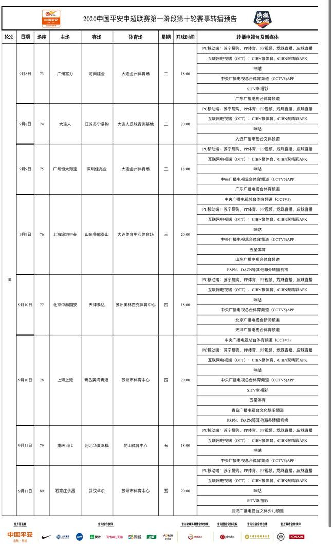 9月8日-9月11日,2020中国平安中超联赛将展开第十轮比赛的较量。中央广播电视总台体育频道(CCTV5)将在9月9日20:00转播大连赛区上海绿地申花VS山东鲁能泰山的比赛,9月10日20:00转播苏州赛区上海上港VS青岛黄海青港的比赛,敬请期待!