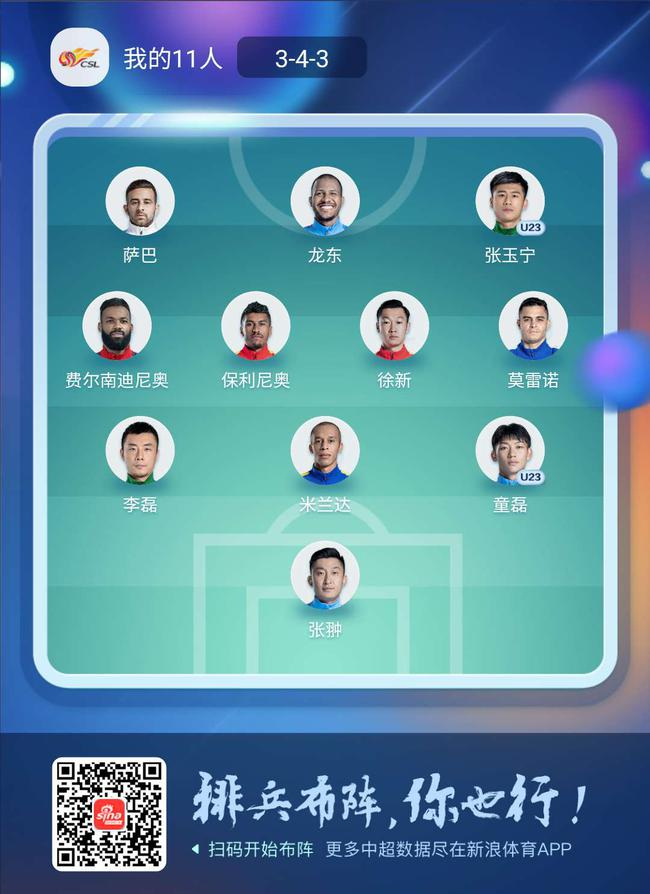 2020赛季中超联赛第一阶段第10轮赛事,富力战胜建业,萨巴体现出攻击线支点的突出作用,主帅范布隆克霍斯特也在证明着率队摆脱困境的能力;恒大战胜佳兆业后提前锁定争冠组资格,保利尼奥继续行使领军职责,本土球员徐新也在进步;国安战胜泰达,张玉宁与李磊两位本土球员表现不俗。以下是新浪体育评选出的中超第一阶段第10轮最佳阵容(3-4-3)——