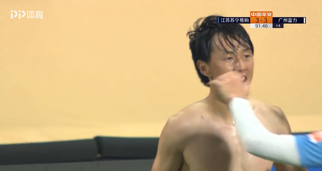 常飞亚完成对苏宁的绝平进球后,十分激动的脱球衣庆祝进球,热泪盈眶。