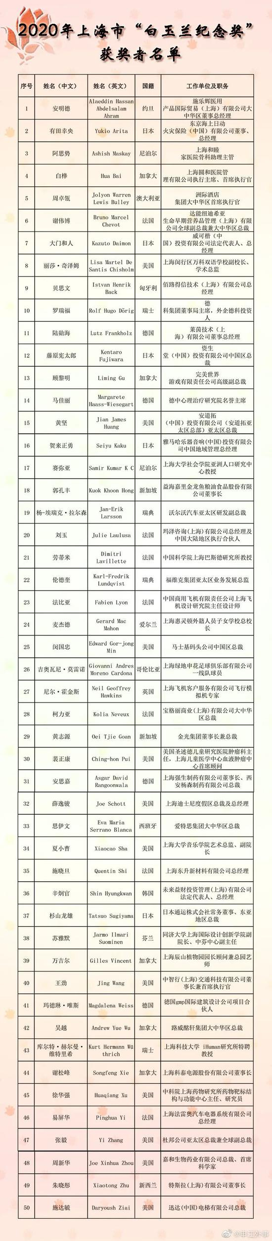 9月16日,2020年上海市“白玉兰纪念奖”颁奖仪式正式举行。 今年,共有19个国家的50位杰出外籍人士获得这一特殊荣誉,获奖者来自经贸、金融、科技、教育、文化、卫生、友好交流等多个领域。