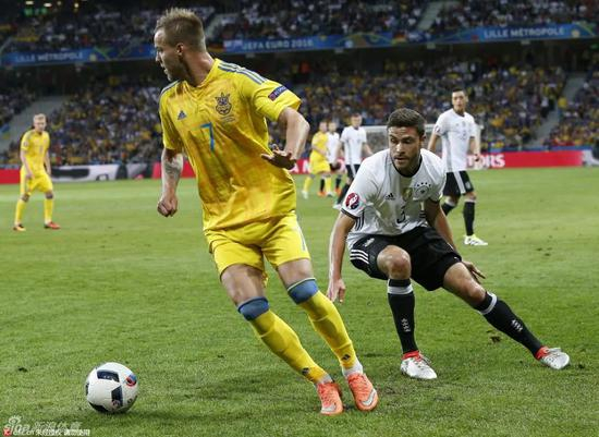 乌克兰国脚亚尔莫连科(左)
