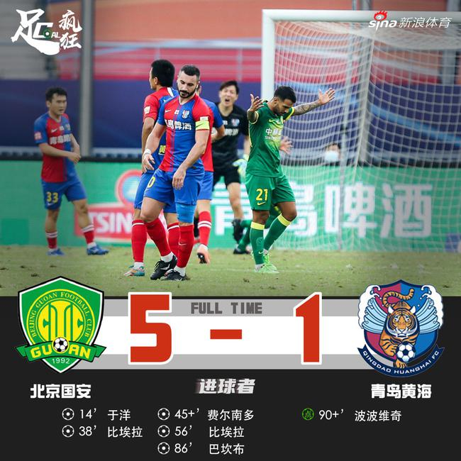 北京时间9月22日下午,2020赛季中超联赛第一阶段第12轮赛事继续进行,北京中赫国安5-1战胜青岛黄海青港,黄海青港遭遇6连败。比埃拉梅开二度,于洋、费尔南多与巴坎布分别建功,阿兰两度击中立柱;奥古斯托在上半场中段拉伤退赛;全场补时阶段波波维奇点球为黄海青港扳回一球。