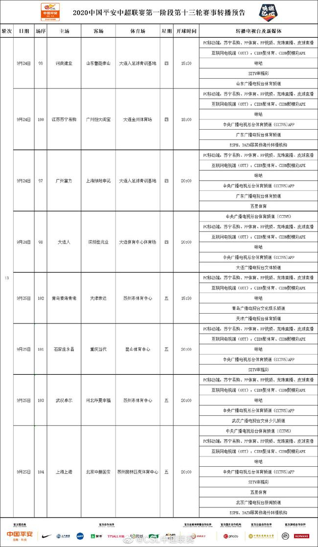 中超第13轮转播:央视关注争四战 京沪战海外直播 新浪体育 新浪体育新闻官方账号 2020.09.2313:39 关注 北京时间9月24日,中超联赛第13轮就将全面打响,本轮比赛转播计划已经出炉,详情如下: