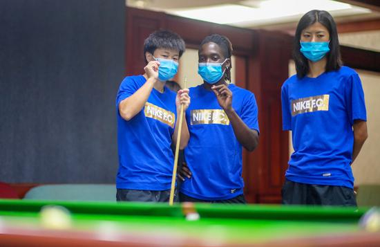 上海女足外援、赞比亚姑娘芭芭拉·班达与队友切磋台球技艺。新华社记者江文耀摄