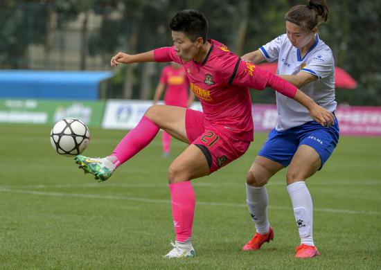 9月2日,江苏苏宁女足球员吴澄舒(前)在比赛中突破。新华社记者江文耀摄