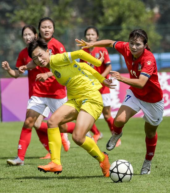 9月12日,浙江杭州女足队球员徐彩平(前右)在女潮联赛第七轮比赛中带球突破。新华社发(陈欣波摄)