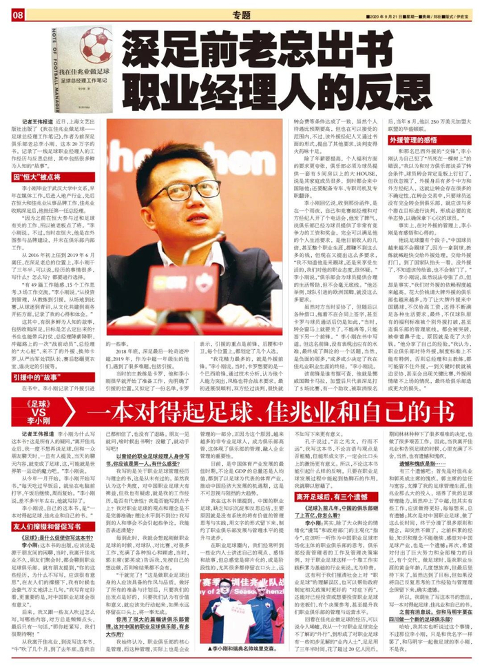 记者王伟报道 近日,上海文艺出版社出版了《我在佳兆业做足球——足球总经理工作笔记》,作者为前深足俱乐部老总李小刚,这本20万字的书,记录了一线足球职业经理人的工作经历与反思总结,其中包括很多鲜为人知的“故事”。