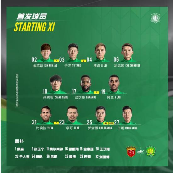 首发:25-郭全博(U23)/4-李磊、2-金玟哉(85‘于大宝)、3-于洋、27-王刚/6-池忠国(85’杨帆)、10-张稀哲(71‘王子铭)、21-比埃拉、23-李可(62’费尔南多)/17-巴坎布、19-阿兰(62‘张玉宁)