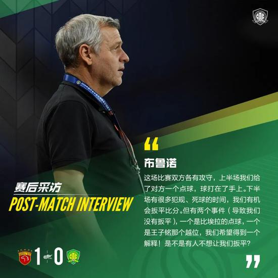 布鲁诺:这场比赛双方各有攻守,上半场我们给了对方一个点球,球打在了手上。下半场有很多犯规、死球的时间,我们有机会扳平比分。但有两个事件(导致我们没有扳平),一个是比埃拉的点球,一个是王子铭那个越位,我们希望得到一个解释!是不是有人不想让我们扳平?