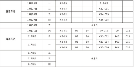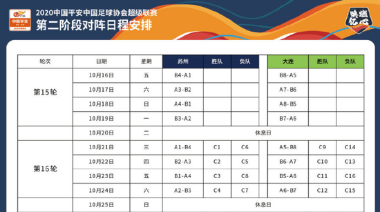 27日,足协官方发布了第二阶段的赛程,按照赛程安排,大连赛区的第1将在10月16日和21日对阵苏州赛区的第4,恒大锁定大连赛区的第1,但华夏和重庆谁排名第4还没有定论。大连赛区的第3将在10月17日和22日对阵苏州赛区的第2,鲁能对阵国安的比赛时间确定。10月18日和23日是上港和申花的对决。苏宁的对手在华夏和重庆之间产生,还没有确定。