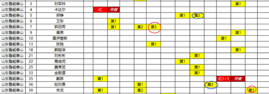 还需要指出的是,来自德转管理员朱艺的消息显示,中超第一阶段的红黄牌将带入第二阶段,这意味着如果第一阶段有3张黄牌,第二阶段随时有停赛的危险。在14轮联赛踢完后,鲁能两名球员有3张黄牌,分别是郭田雨和宋龙,两名球员有两张黄牌,分别是郑铮和段刘愚,四名球员在未来的比赛都要更注意自己的动作。
