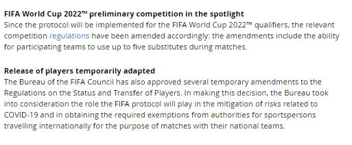 10月2日消息,国际足联官方宣布,2022年卡塔尔世界杯预选赛每队单场可换5人。