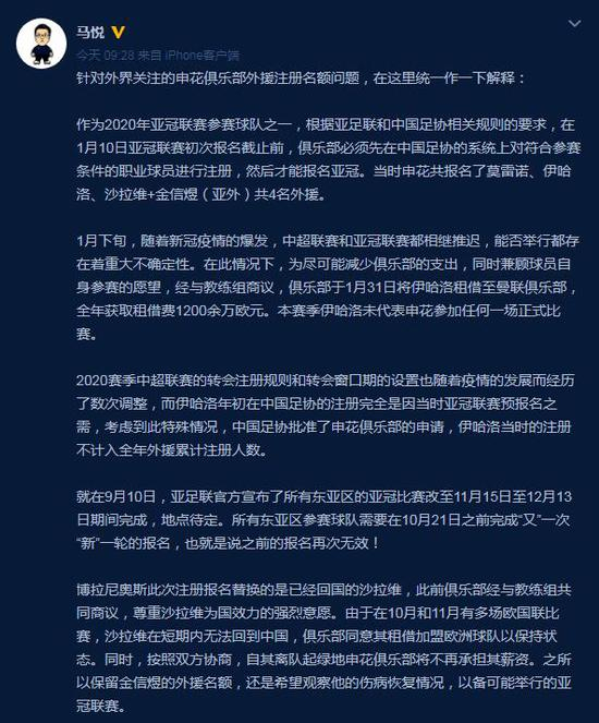 对此,申花俱乐部新闻官进行回应,核心内容为:虽然申花在1月就为伊哈洛在中超注册,但这是报名亚冠的流程需要,亚冠联赛至今没踢,10月21日要进行新一轮报名,此前1月为伊哈洛的报名自然作废。本赛季伊哈洛并未效力申花,而是租借去了英超曼联。考虑到实际情况,中国足协最终还是批准申花俱乐部的申请,伊哈洛年初的注册不计入全年外援累计注册人数。