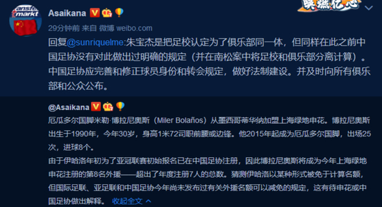著名足球网站《德国转会市场》中国区管理员朱艺发微博表示:申花已经给厄瓜多尔国脚博拉尼奥斯进行注册,但此事存在一定争议。由于伊哈洛年初为了亚冠联赛初始报名已在中国足协注册,博拉尼奥斯将成为今年上海绿地申花注册的第8名外援——超出年度注册7人的总数。