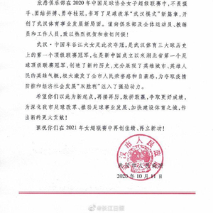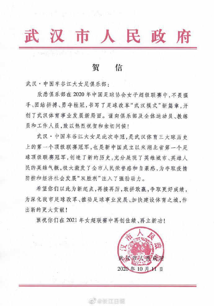 10月11日,武汉市人民政府向刚刚在2020年女超联赛中夺冠的武汉·中国车谷江大女足发去贺信,称这次夺冠充分展现了英雄城市、英雄人民的英雄气概,并预祝武汉女足在2021年女超联赛中再创佳绩、再立新功!