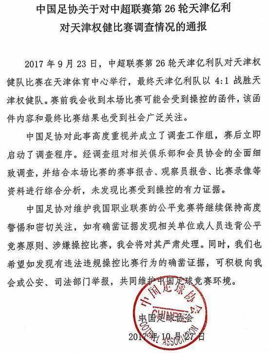 迫于巨大的舆论压力,中国足协在四天后公布了官方调查结果,“没有没有发现这场比赛受到操控的有力证据。”