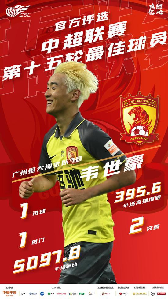10月19日晚,2020中国平安中超联赛第十五轮战罢,广州恒大淘宝队球员韦世豪凭借优异表现,当选本轮联赛最佳球员。韦世豪也成为本赛季继金敬道之后,第二名当选中超联赛官方当轮最佳的本土球员。