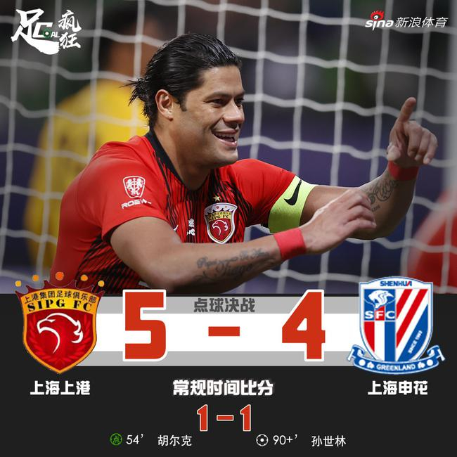 进入点球大战阶段。申花先罚,莫雷诺左脚推射球门左下角,陈威成功单掌扑出!胡尔克推射球门左下角命中,曾诚判断错方向,第一轮上港1比0领先。第二轮博拉尼奥斯打球门左侧得分,陈威判断错方向,1比1,穆伊大力怒射球门左上角得分,曾诚判断错方向,第二轮上港2比1领先。第三轮曹赟定推射球门右侧命中,陈威判断错方向,2比2;吕文君大力打球门左侧,曾诚判断准确,但未扑到,第三轮上港3比2领先。第四轮杨旭骗过陈威,打球门左下角得分,3比3,买提江左脚推射球门左侧得分,4比3;第五轮孙世林左脚推射球门左下角轻松得分,4比4,奥斯卡打球门右侧得分,5比4!上港战胜申花晋级四强!