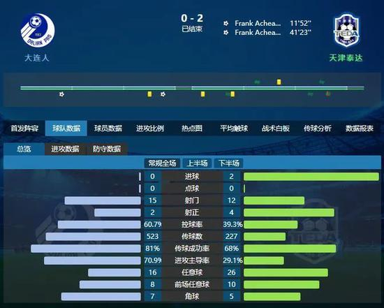 从表面上来看,这场比赛是阿奇姆彭单挑大连人门将张翀的胜利,但从比赛内容来看,泰达取得胜利的原因绝非阿奇姆彭脚风顺、张翀低级失误多这么简单。赛后技术统计显示,当泰达队和大连队控球率比为 39.3% 比 60.7% ,进攻主导率为 29.1% 比 70.9% 时,从数据上和场面上看,这是一场一边倒的比赛,但最终看似处于劣势的泰达却能稳稳拿下比赛,这一定不是某个人决定了比赛,而是球队的战术体系发挥了威力。