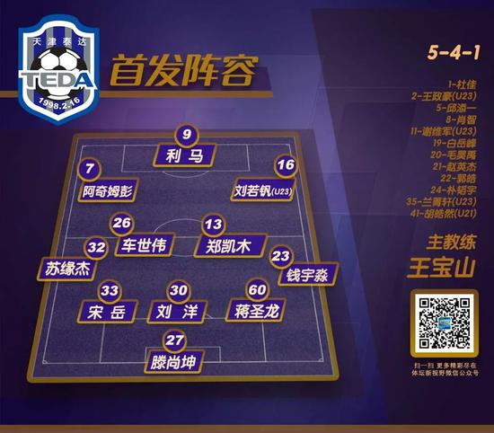此役王宝山继续排出五后卫阵型,因巴斯蒂安斯和艾哈迈多夫提前回国,苏亚雷斯有伤在身,泰达队首发阵容中只有利马和阿奇姆彭两名外援出战,此外,钱宇淼、刘若钒、车世伟等轮换球员也进入首发阵容。