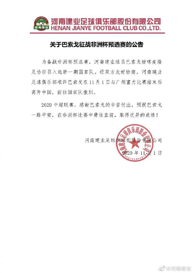 北京时间11月1日,河南建业官方微博宣布巴索戈即将离开建业跟随喀麦隆国家队征战非洲杯预选赛。