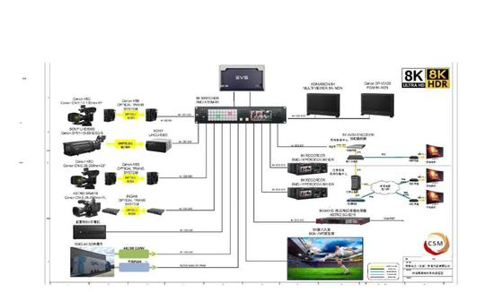 输入信号包括:4组迅道摄像机信号(1号机大全,2号机特写,两端球门后特写机位),其中CAM3使用INCAM SIMPLY-8K 12G光传输系统;8K字幕机信号(4×12G-2SI的8K信号方式输出的FILL信号,4×12G-2SI的8K信号方式输出的KEY信号);1组EVS-8K慢动作服务器(4×12G-2SI的8K信号方式输出的实时回放信号);1组4K信号(来自SMT S2转播车制作的4K-HDR公用信号,利用切换台自带的上转功能,实现信号4K-8K的信号上转);
