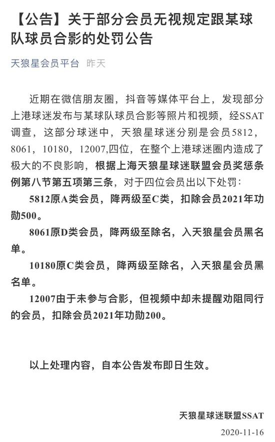 16日,上海上港著名的球迷组织“天狼星”球迷会官方发布了一则公告,内容显示:因组织内部分上港球迷与申花球员合影,“造成不良影响”,被该球迷组织开除、并入会员黑名单。