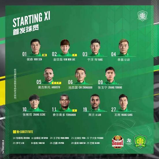门将位置上侯森出战,后防线上金玟哉搭档于洋,李磊和王刚分列两个边路。中场依旧人才济济,张稀哲、池忠国、费尔南多同时首发,奥古斯托戴上了队长袖标,他依然是国安进攻组织的核心。前锋位置上,由于巴坎布无法出战亚冠比赛,热内西奥选择了阿兰来搭档张玉宁。
