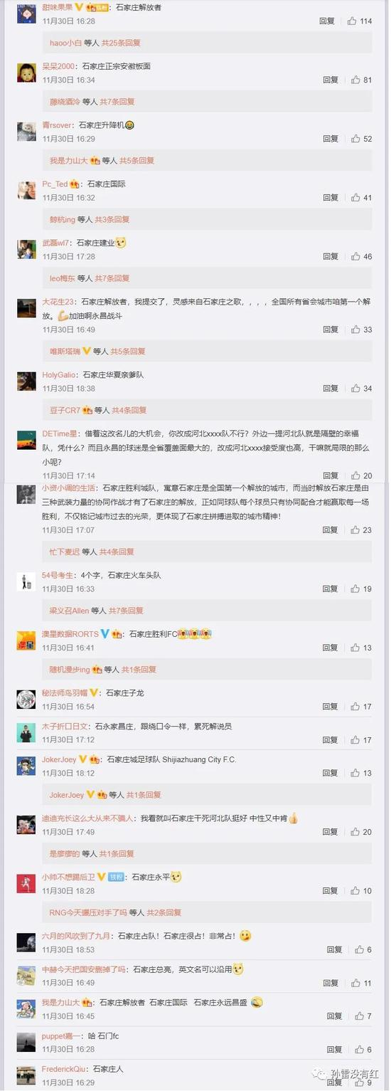 11月30日,石家庄永昌官方发了条微博,征集俱乐部全新的中性名称。一天之后,这条微博下的评论已经接近700,许多内容是这样的: