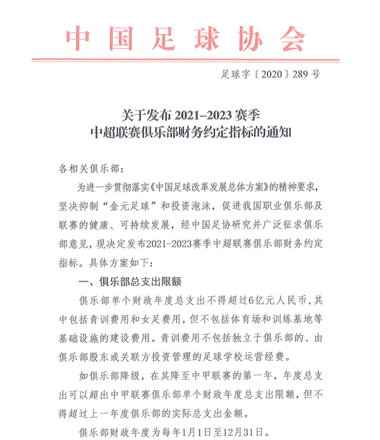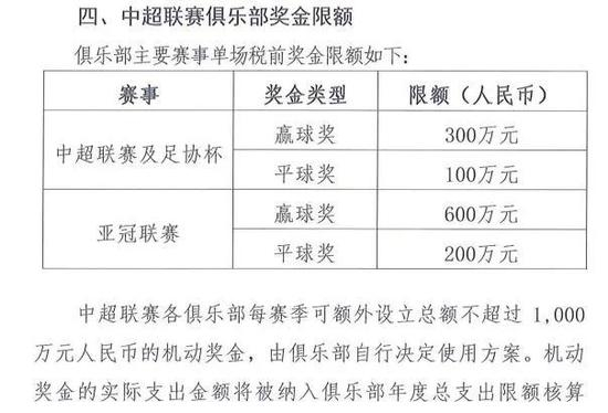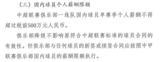 “中超一线队国内球员年薪不得超过税前500万元,平均年薪不得超过税前300万元,外援年薪不超过税前300万欧元。中超俱乐部年度支出不得超过6亿人民币……”