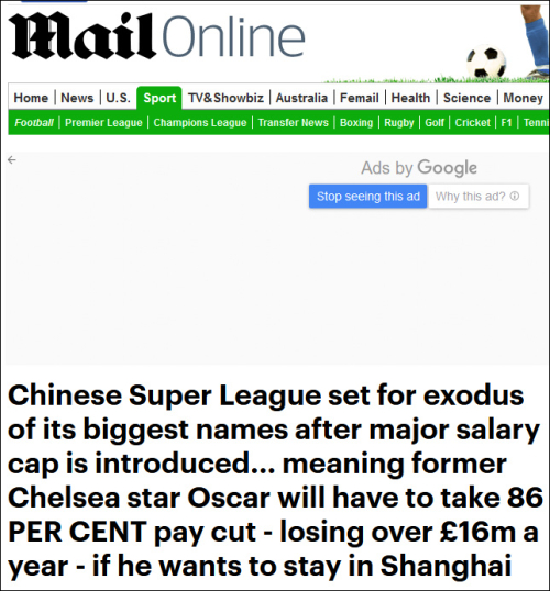 《每日邮报》指出,新规之下,切尔西旧将的年薪将下降近86%。有类似境遇的还有国安外援巴坎布,鲁能外援佩莱、江苏队外援特谢拉等等。