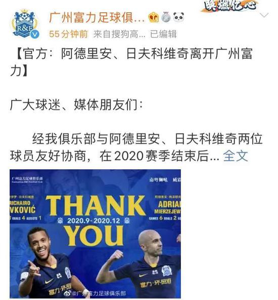 经我俱乐部与阿德里安、日夫科维奇两位球员友好协商,在2020赛季结束后,这两名球员将不再为广州富力效力。