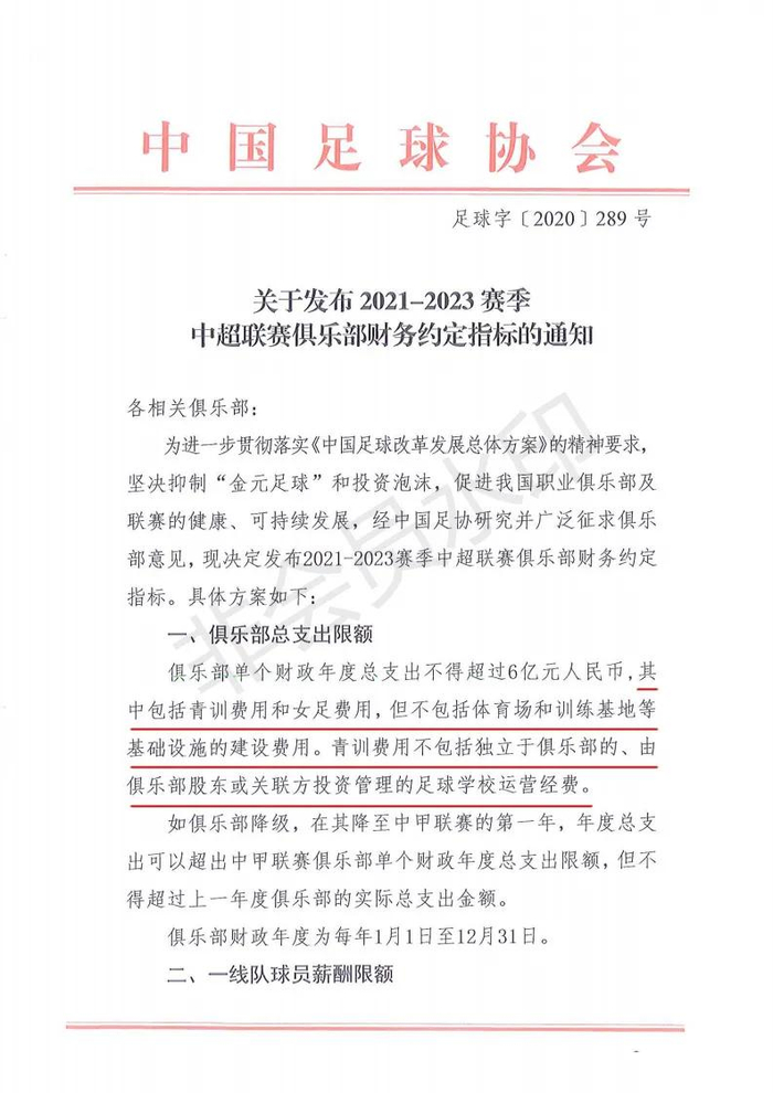 按照足协上海会议(中国足球职业联赛专项治理工作会议)发布的2021-2023赛季各级职业联赛俱乐部财务约定指标通知文件,接下来的3年,中超俱乐部年度总支出限额为6亿(人民币,下同),中甲是2亿,中乙则是5000万。文件规定,总支出包括青训费用和女足费用,不包括体育场和训练基地等基础设施建设费用;此外,青训费用不包括独立于俱乐部,由俱乐部股东或关联方投资管理的足校运营费用。