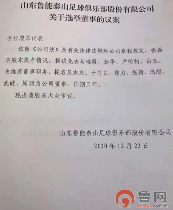 鲁网12月23日讯(记者 徐英淦)最近,一张“山东鲁能泰山足球俱乐部股份有限公司关于选举董事的议案”图片在网上曝光并引起热议,从图中内容来看,包括现任俱乐部总经理孙华在内的5名董事被提议免去董事职务,另提名7位新董事,包括吴志东、于书立等。