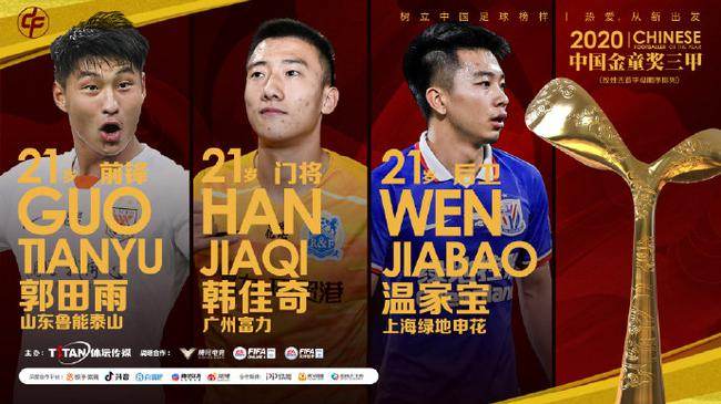 2020中国金童奖三甲:郭田雨(山东鲁能泰山)、韩佳奇(广州富力)、温家宝(上海绿地申花)