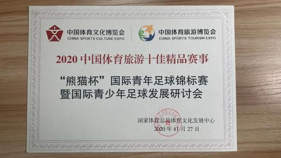 经过多年努力,“熊猫杯”所取成绩是有目共睹的。11月,在国家体育总局体育文化发展中心评选2020年中国体育旅游精品项目中,成都自主IP国际赛事“熊猫杯”国际青年足球锦标赛暨国际青少年足球发展研讨会积极参选,成功获评为“十佳精品赛事”,这也是成都市乃至四川省唯一一个入围“十佳”的赛事活动。