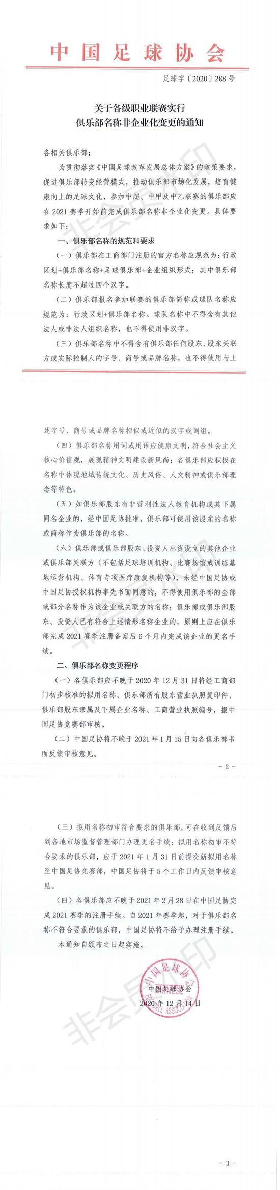2020年12月14日,中国足协在上海召开职业联赛专项治理工作会,要求所有的职业俱乐部,必须使用中性名,给出了“六点规范”,同时要求在2020年12月31日前,将经工商部门初步核准的拟用名称、俱乐部所有股东营业执照复印件、俱乐部股东隶属及下属企业名称、工商营业执照编号,报足协竞赛部审核。