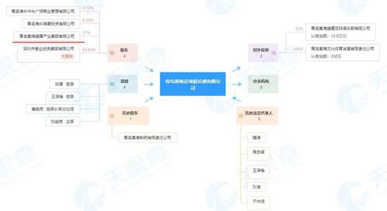 不过,黄海俱乐部股东之一是青岛黄海健康产业集团,占股比例为27%,此外,第一大股东深圳市衡业投资集团有限公司(持股63.63%),旗下也有2家名字中带有“黄海”的企业,其一便是青岛黄海健康产业集团有限公司,拥有100%股份;而青岛黄海健康产业集团有限公司旗下持股公司中,也拥有多家名字带“黄海”的企业。