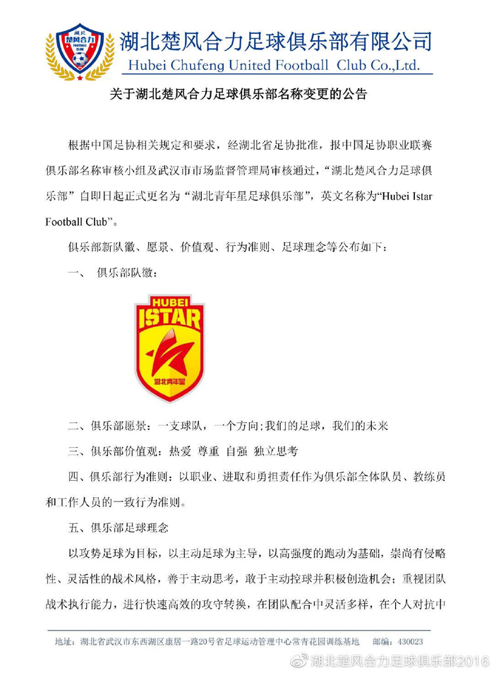 根据中国足协相关规定和要求,经湖北省足协批准,报中国足协职业联赛俱乐部名称审核小组及武汉市市场监督管理局审核通过,“湖北楚风合力足球俱乐部”自即日起正式更名为“湖北青年星足球俱乐部”,英文名称为“Hubei Istar Football Club”。