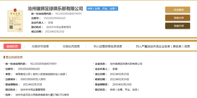 北京时间1月14日,根据国家企业信用信息公示系统显示,石家庄永昌足球俱乐部正式完成更名,新名称为沧州雄狮足球俱乐部,同时也印证了此前前往沧州的传闻。
