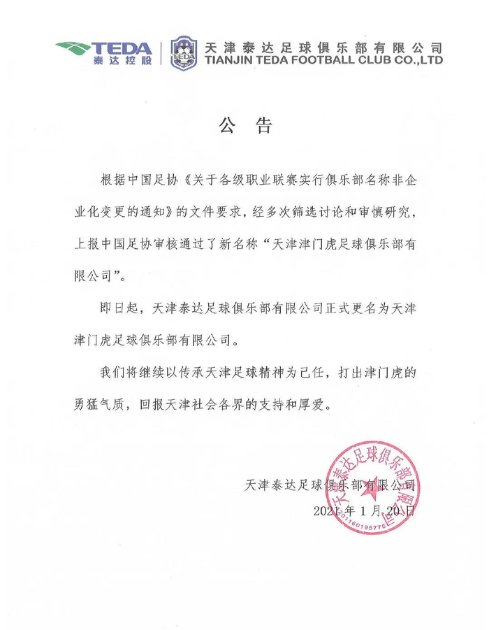 记者鲁蜜报道 1月20日天津泰达正式更名为天津津门虎,陪伴天津球迷23年的“泰达”二字也到了说再见的时候了。这则消息,也是进入冬训以来,俱乐部唯一确定的事情。在俱乐部的改名公告中提道:“我们将继续以传承天津足球精神为己任,打出津门虎的勇猛气质,回报天津社会各界的支持和厚爱。”这句话多少可以让天津球迷悬着的心得到少许安慰——津门虎是中超球队中除亚冠参赛队之外唯一还没集结冬训的球队,这种状态引人担心。