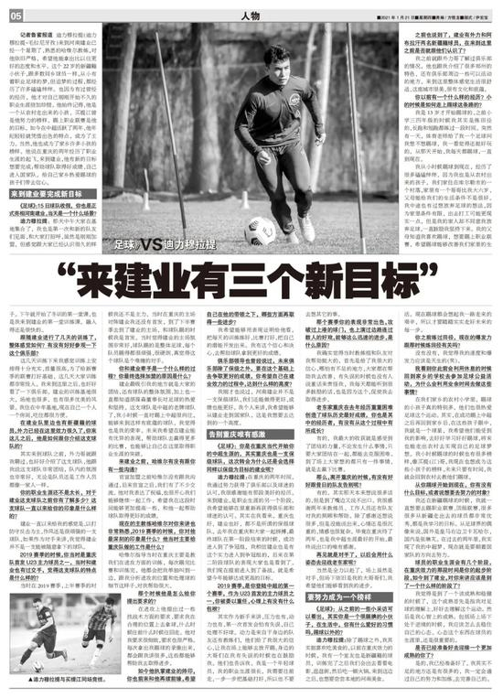 我还在新疆踢球的时候,我就一直想要去踢职业联赛、顶级联赛,很多很多从新疆走出去的球员都非常优秀,都是我学习的目标。从足球界的偶像来说,国外是皇马右边卫卡瓦哈尔,国内是张琳芃。在过去的两年里,我实现了我的中超梦,现在就是要朝着国家队的方向去努力。